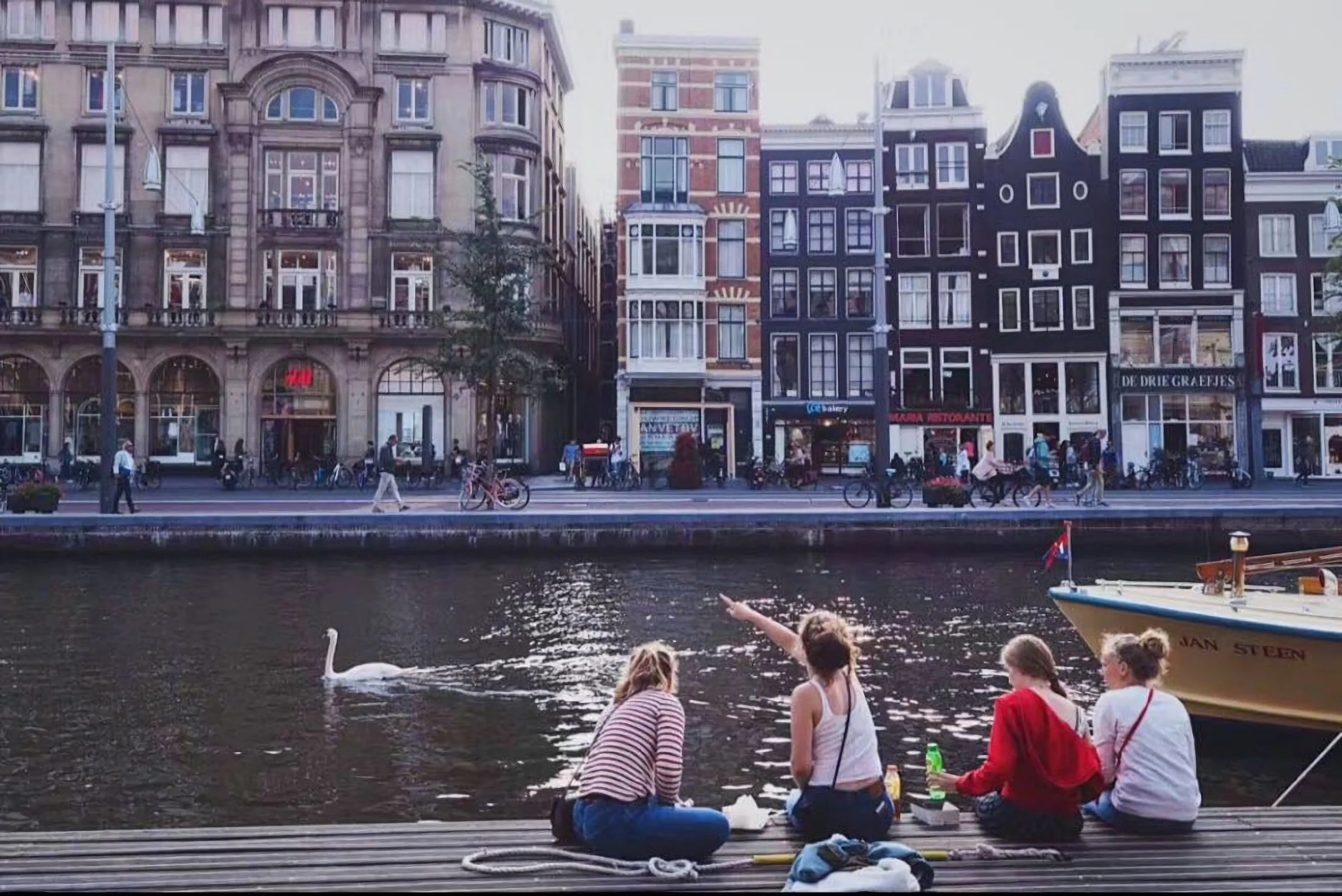 Dining together, people basking in the sun, canal water sound, waterbirds, wind, bicycles, running boats, chatting people...