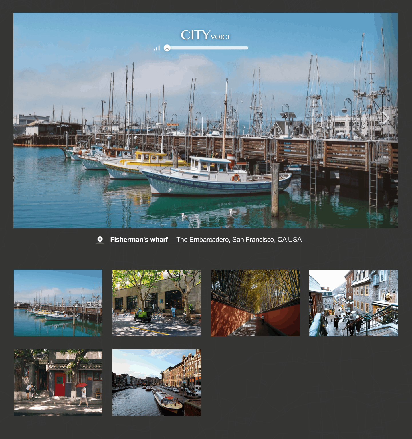 Users can choose the sounds of their cities according to their preferences, or the system can switch cities randomly. At the same time, users can also view detailed information about the city.